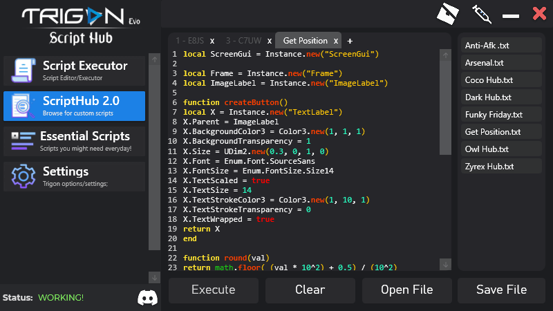 Trigon Evo is a Lua script execution tool that makes scripting easy and fast due to its user-friendly interface. Trigon Executor offers plenty of new features, like a free script hub and an option to select from an elegant, pre-installed custom theme.